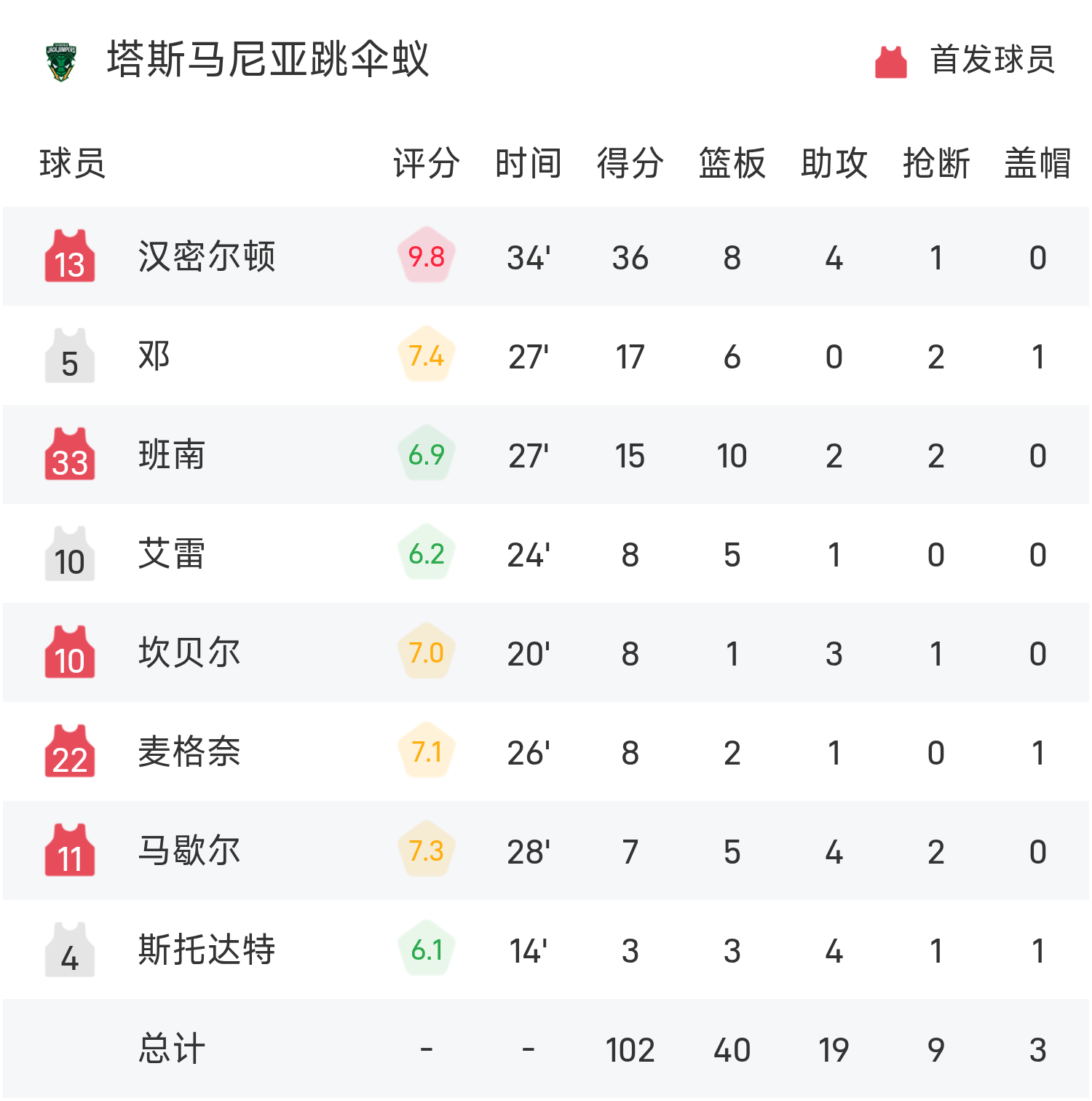 6686体育app11月06日讯 25/26赛季NBL 常规赛,塔斯马尼亚跳伞蚁对阵东南墨尔本凤凰。双方全场战罢,塔斯马尼亚跳伞蚁102-103不敌东南墨尔本凤凰。索比得到28分3板4助率队取胜,汉密尔顿空砍全场最高的36分8板4助。