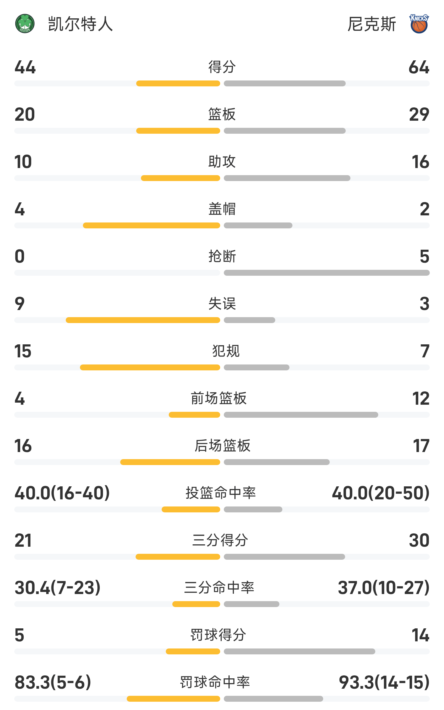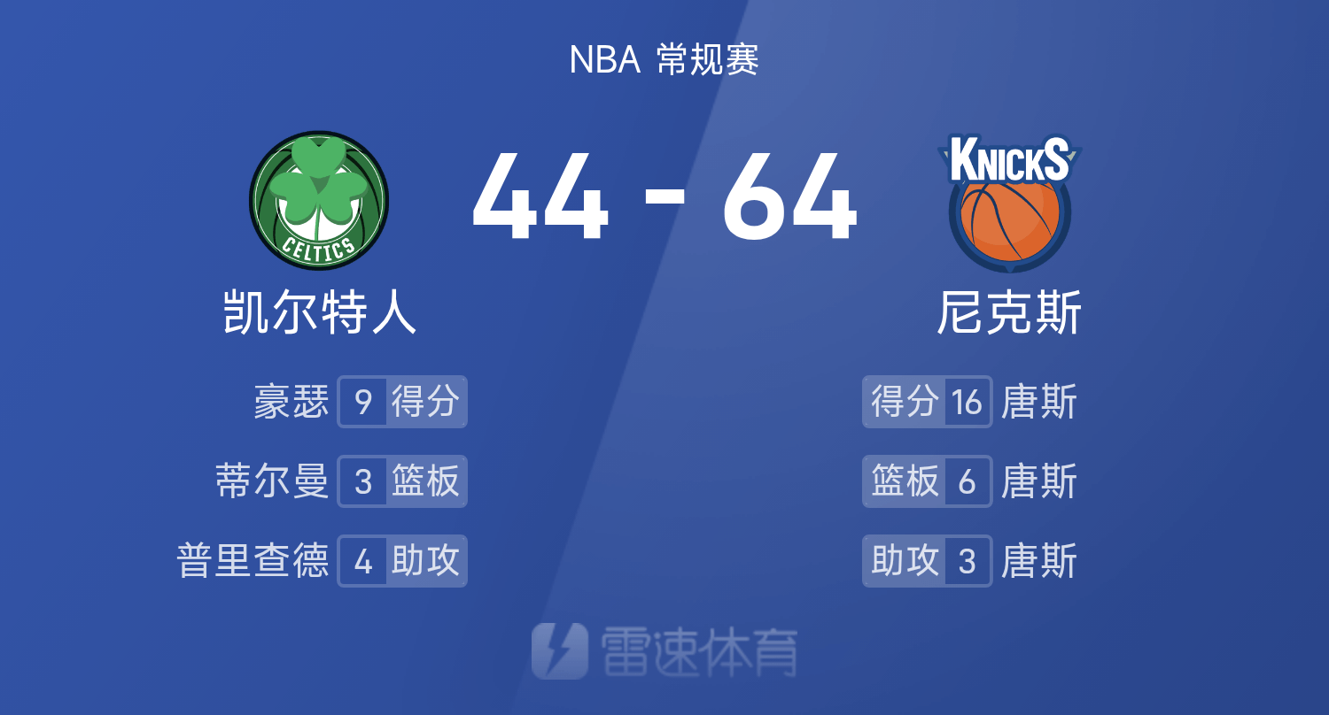 6686体育app10月25日讯 25/26赛季NBA 常规赛,尼克斯对阵凯尔特人。双方半场战罢,尼克斯64-44领跑位凯尔特人。