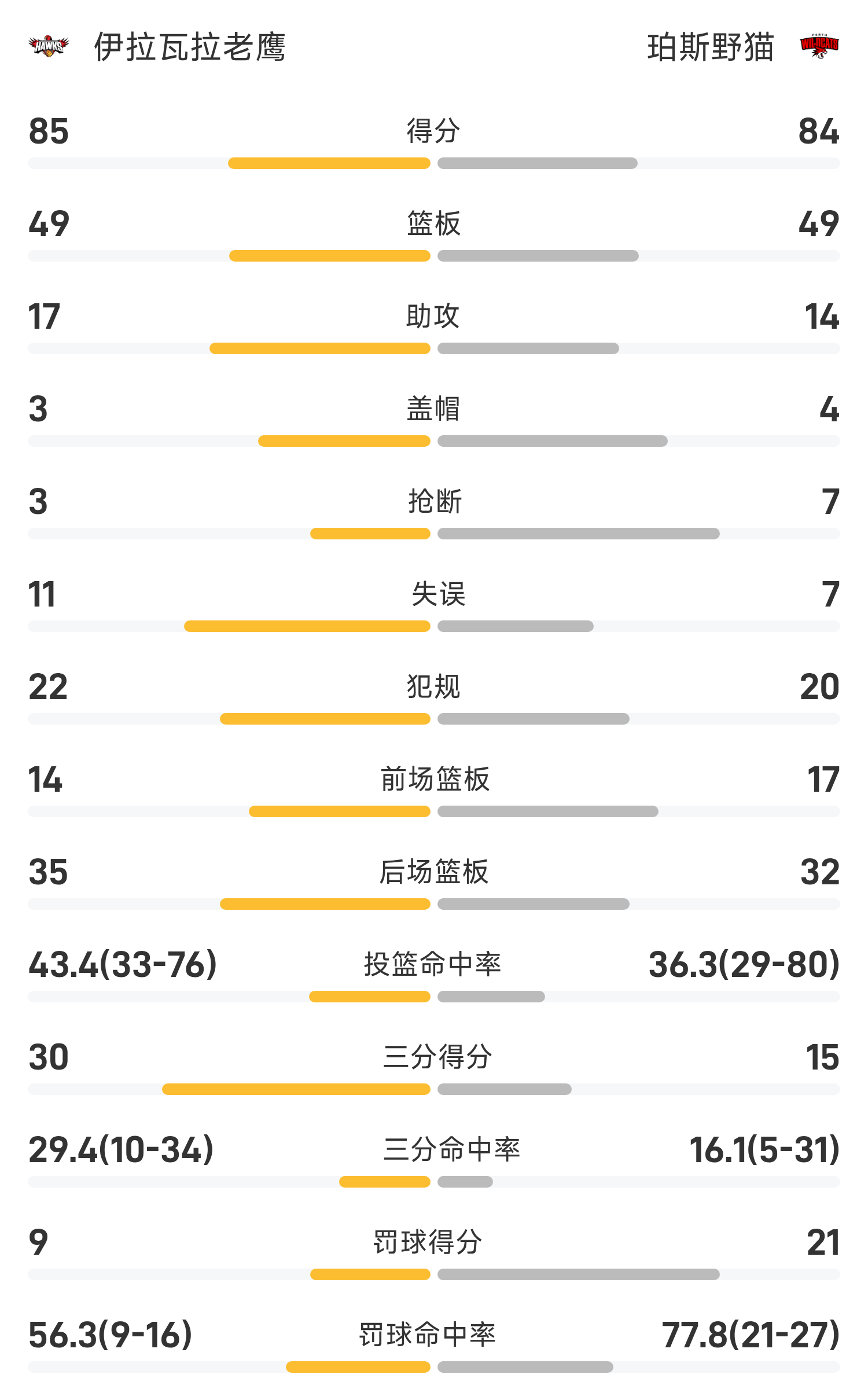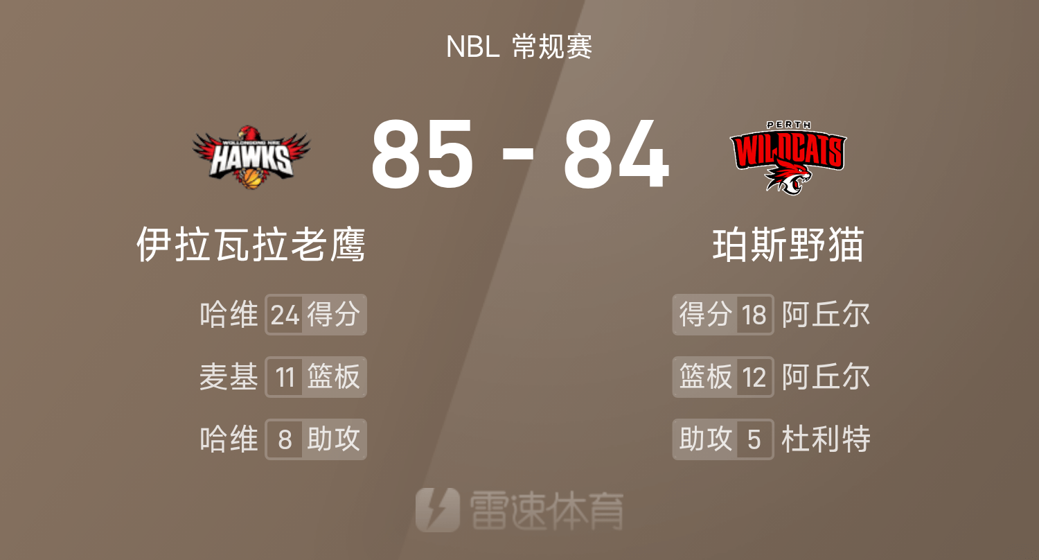 6686体育app10月25日讯 25/26赛季NBL 常规赛,珀斯野猫对阵伊拉瓦拉老鹰。双方全场战罢,珀斯野猫84-85不敌伊拉瓦拉老鹰。哈维砍下全场最高的24分5板8助,率领伊拉瓦拉老鹰胜利取胜。