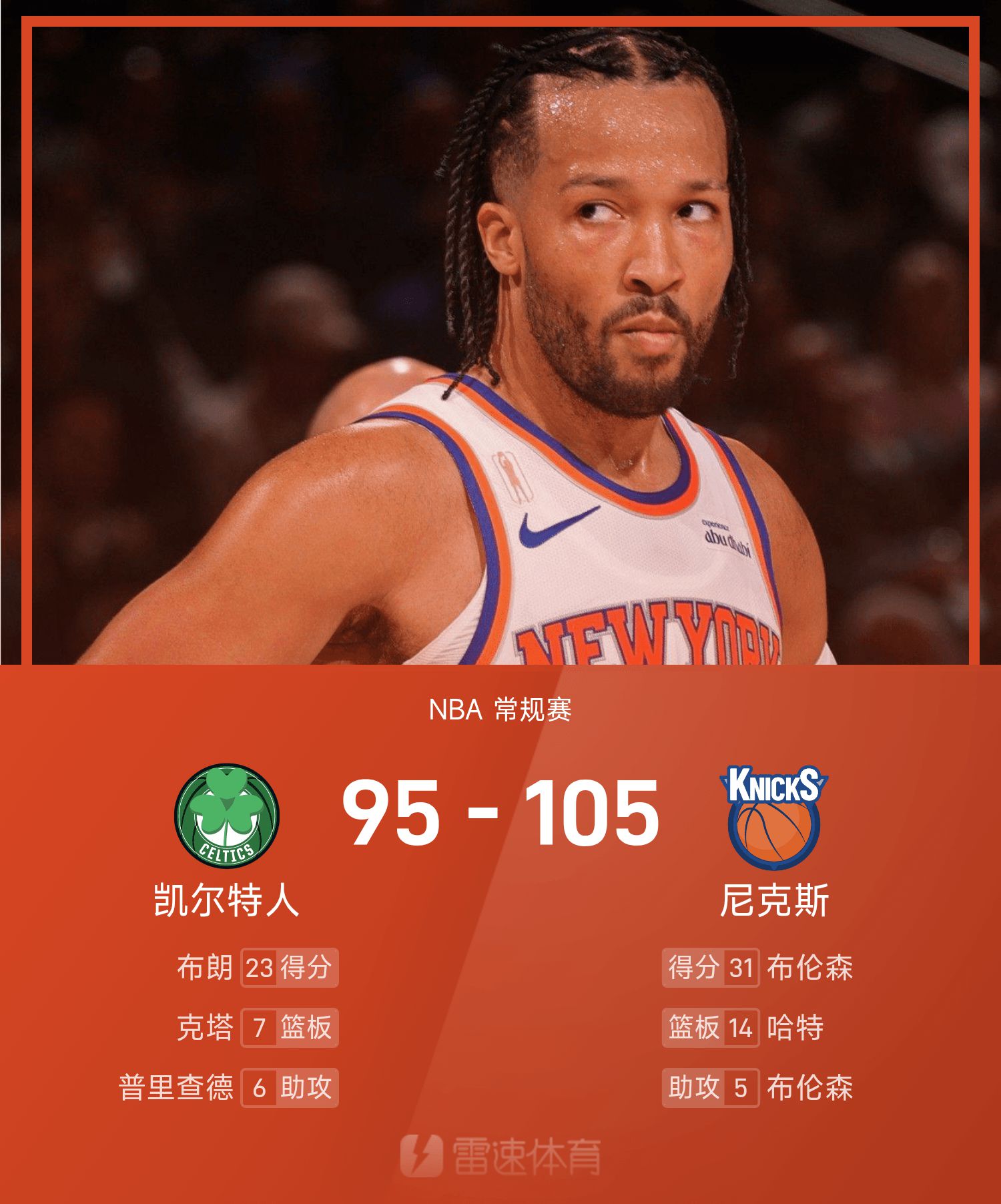 6686体育app10月25日讯 25/26赛季NBA常规赛,尼克斯对阵凯尔特人。双方全场战罢,尼克斯105-95战胜凯尔特人。布伦森砍下全场最高的31分3板5助,率领尼克斯胜利取胜。