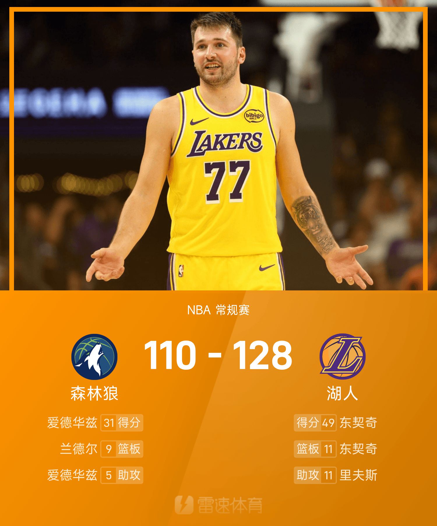 NBA战报:东契奇49分11板8助,湖人128-110轻取森林狼