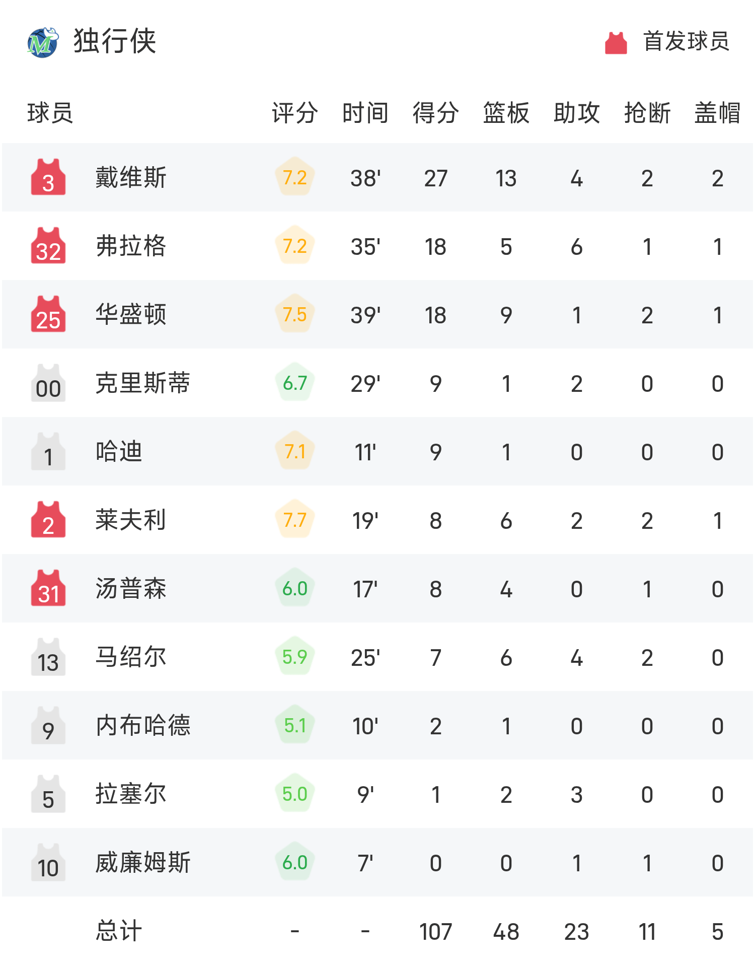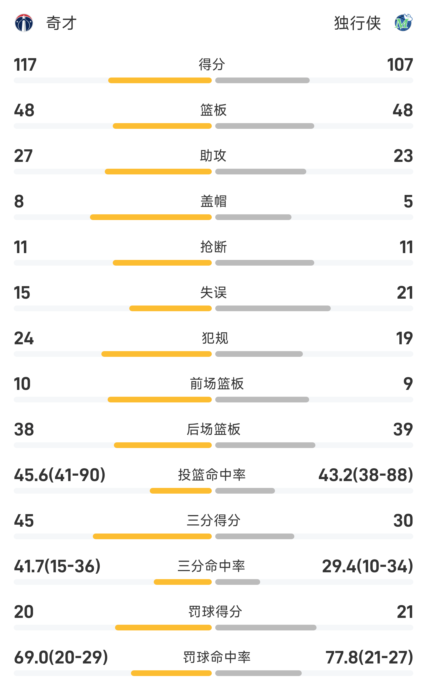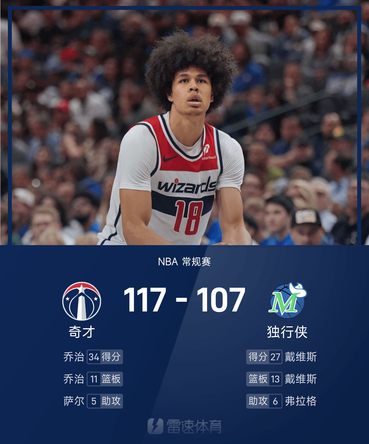 6686体育app10月25日讯 25/26赛季NBA 常规赛,独行侠对阵奇才。双方全场战罢,独行侠107-117不敌奇才。乔治砍下全场最高的34分11板4助,率领奇才胜利取胜。