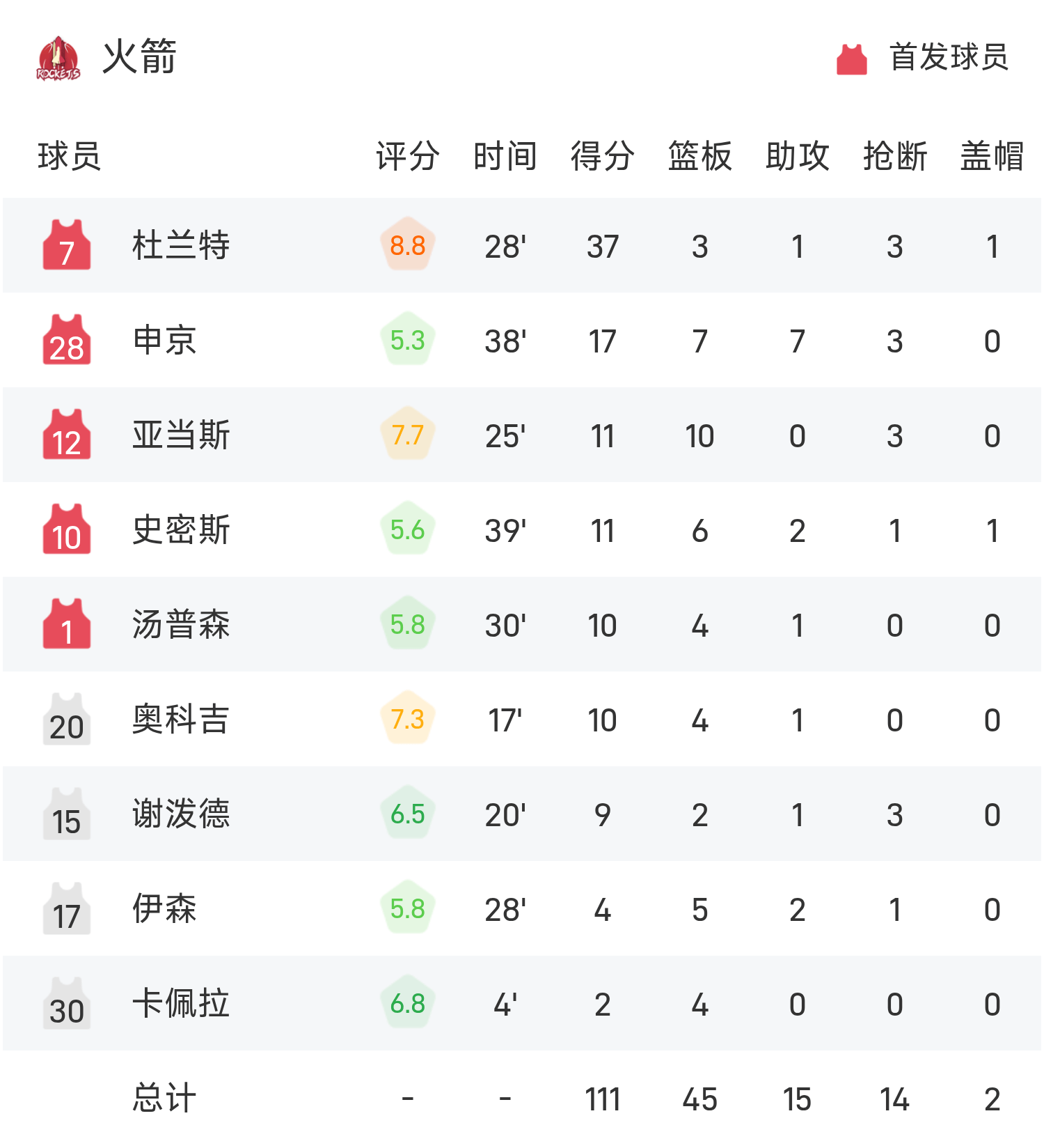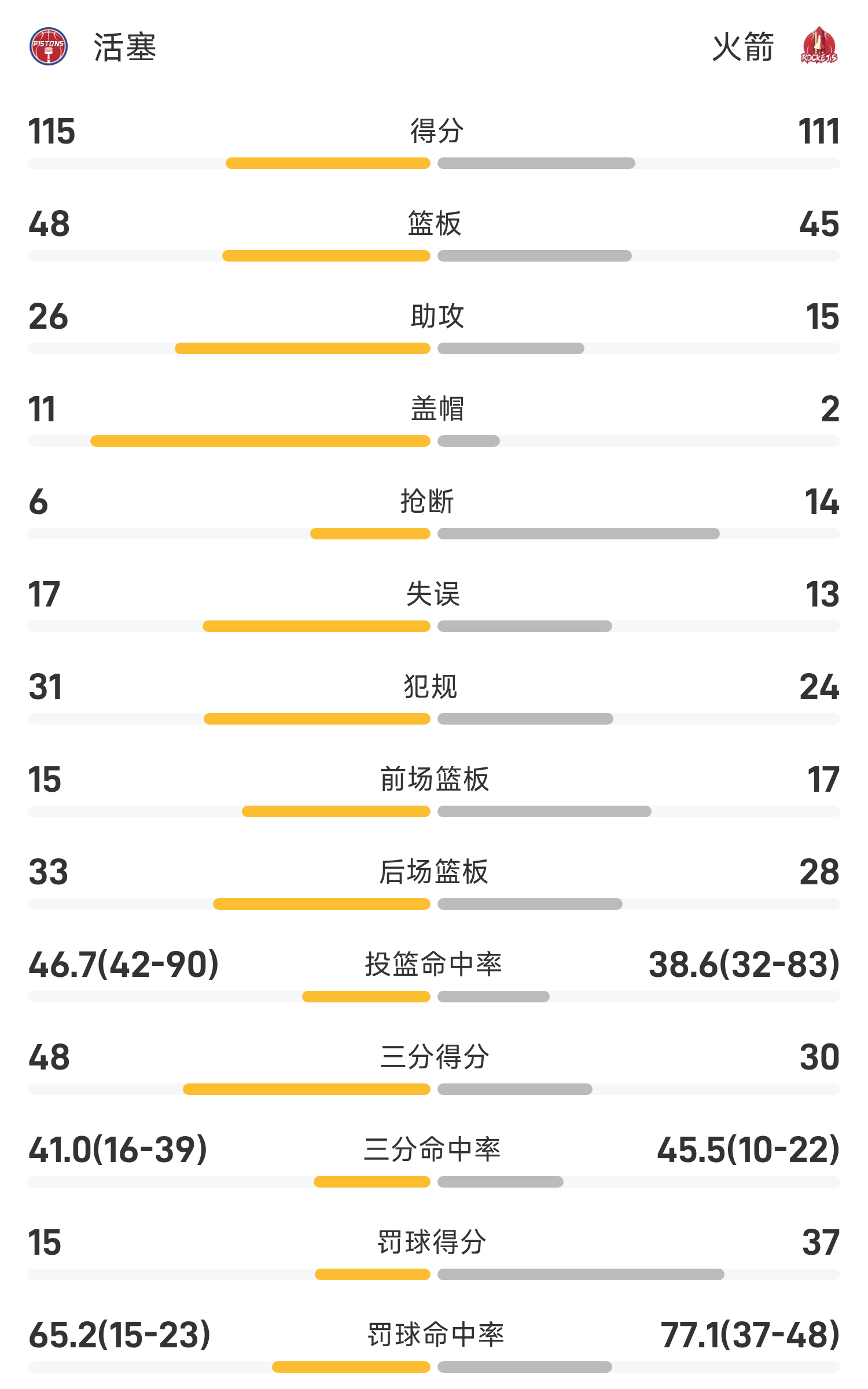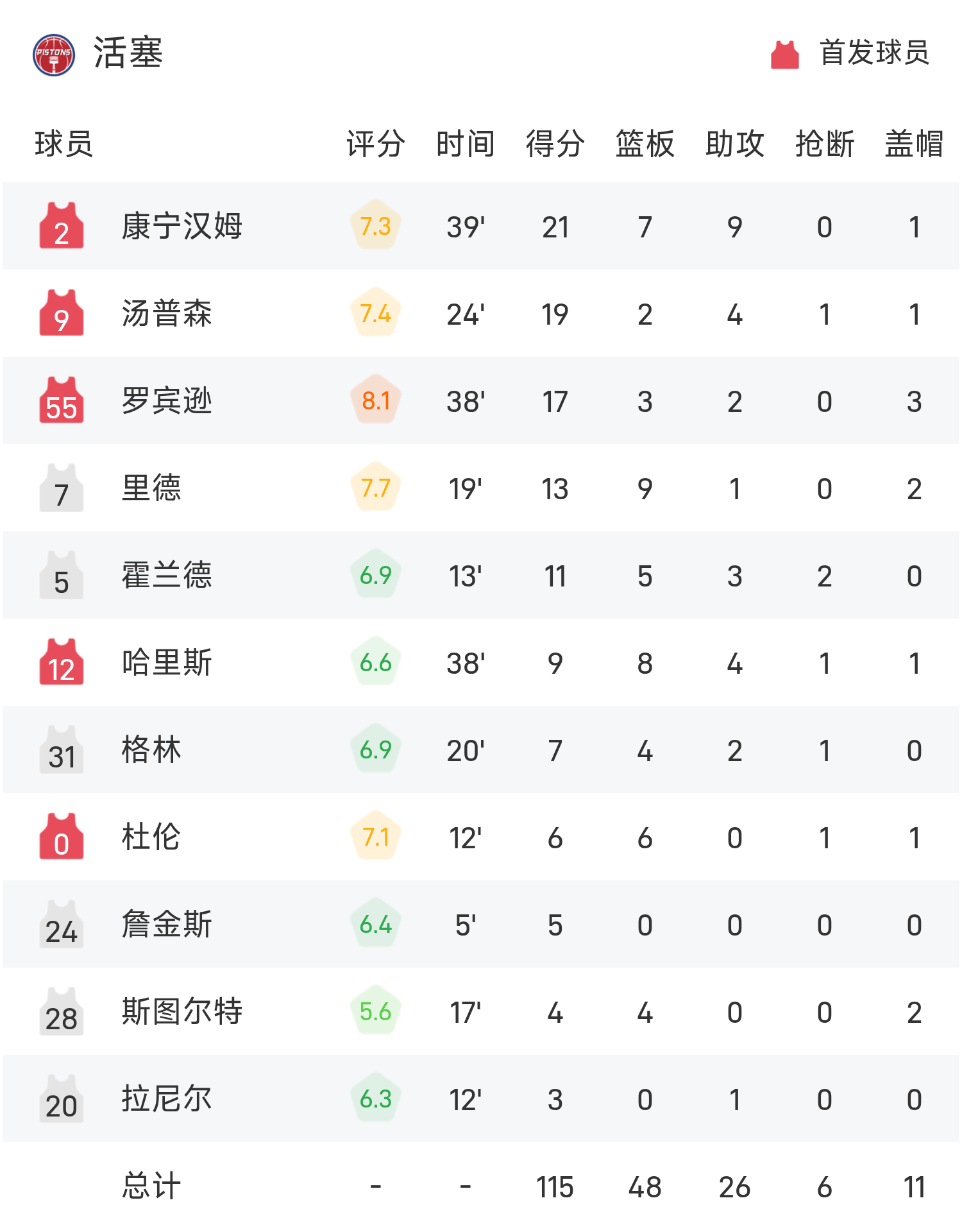 NBA战报:康宁汉姆21分7板9助,活塞115-111火箭