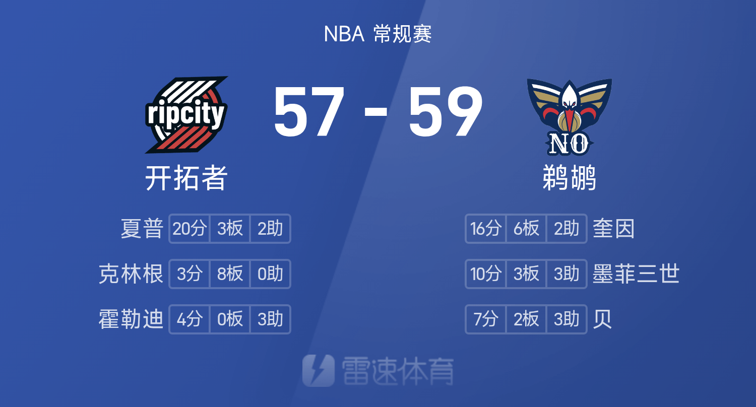 NBA半场:奎因16+6,杨瀚森暂未登场,开拓者57-59鹈鹕