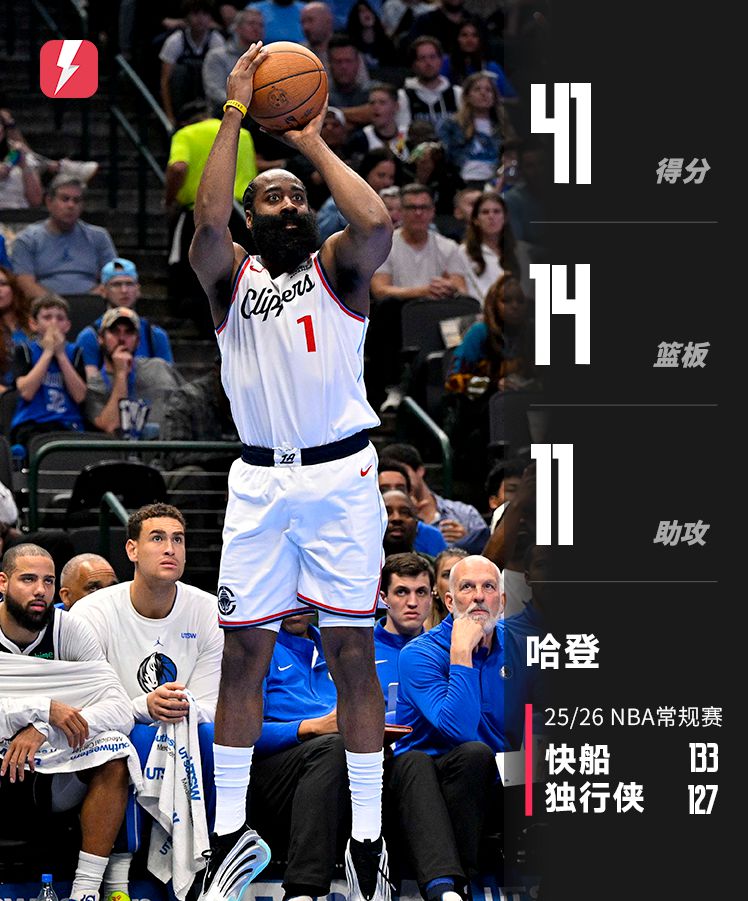 本场竞赛快船球星哈登出战51分03秒,25投13中,其中三分球12投6中,罚篮11罚9中,得到41分13抢篮板11助攻1截球2封盖的全面数据。
