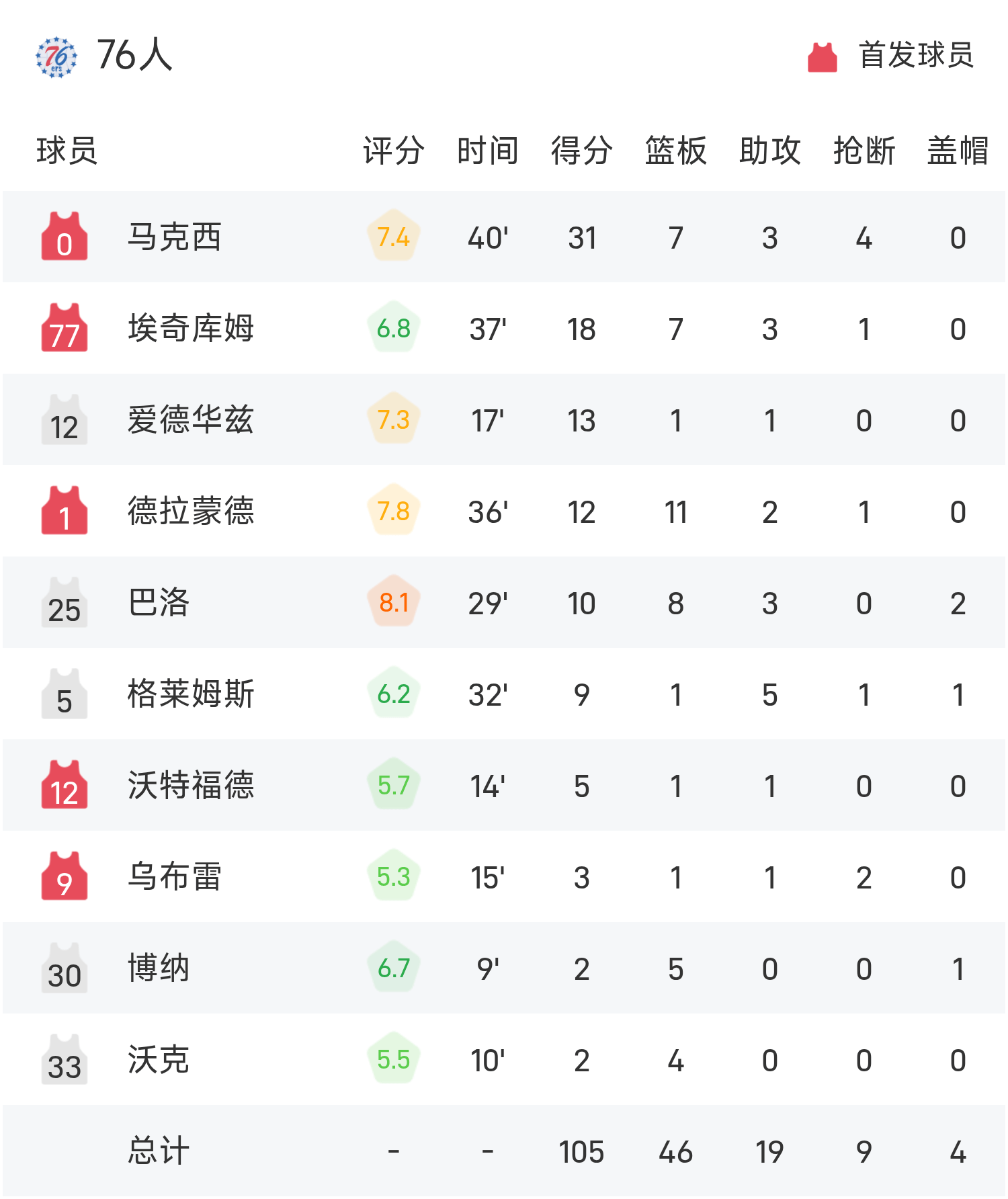 6686体育app11月15日讯 25/26赛季NBA 常规赛 NBA杯分组赛,活塞对阵76人。双方全场战罢,活塞114-105战胜76人。格林得到21分9板3助率队取胜,马克西空砍全场最高的31分7板3助。