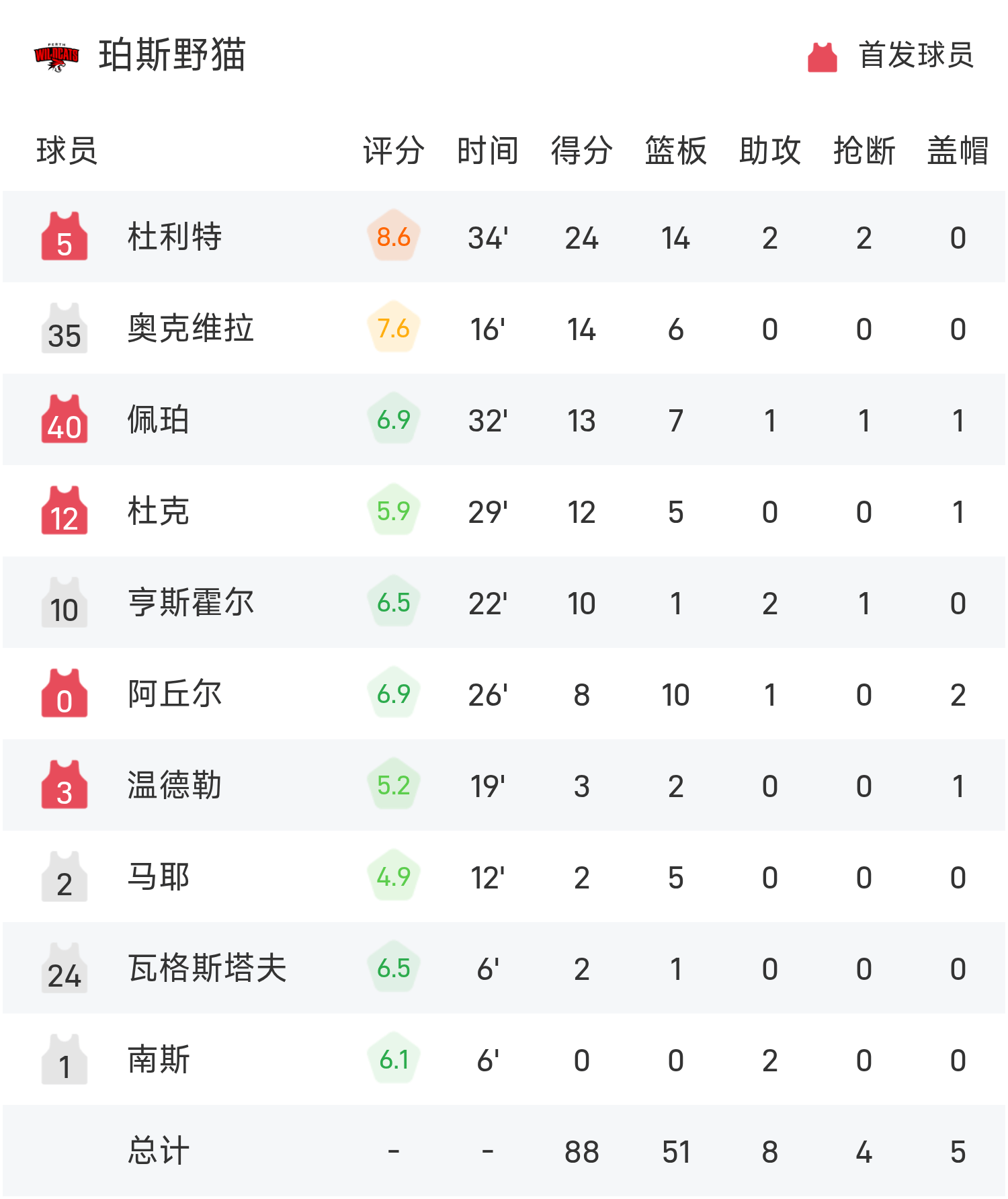 6686体育app11月15日讯 25/26赛季NBL 常规赛,珀斯野猫对阵新西兰毁坏者。双方全场战罢,珀斯野猫88-75战胜新西兰毁坏者。杜利特砍下全场最高的24分14板2助,率领珀斯野猫胜利取胜。