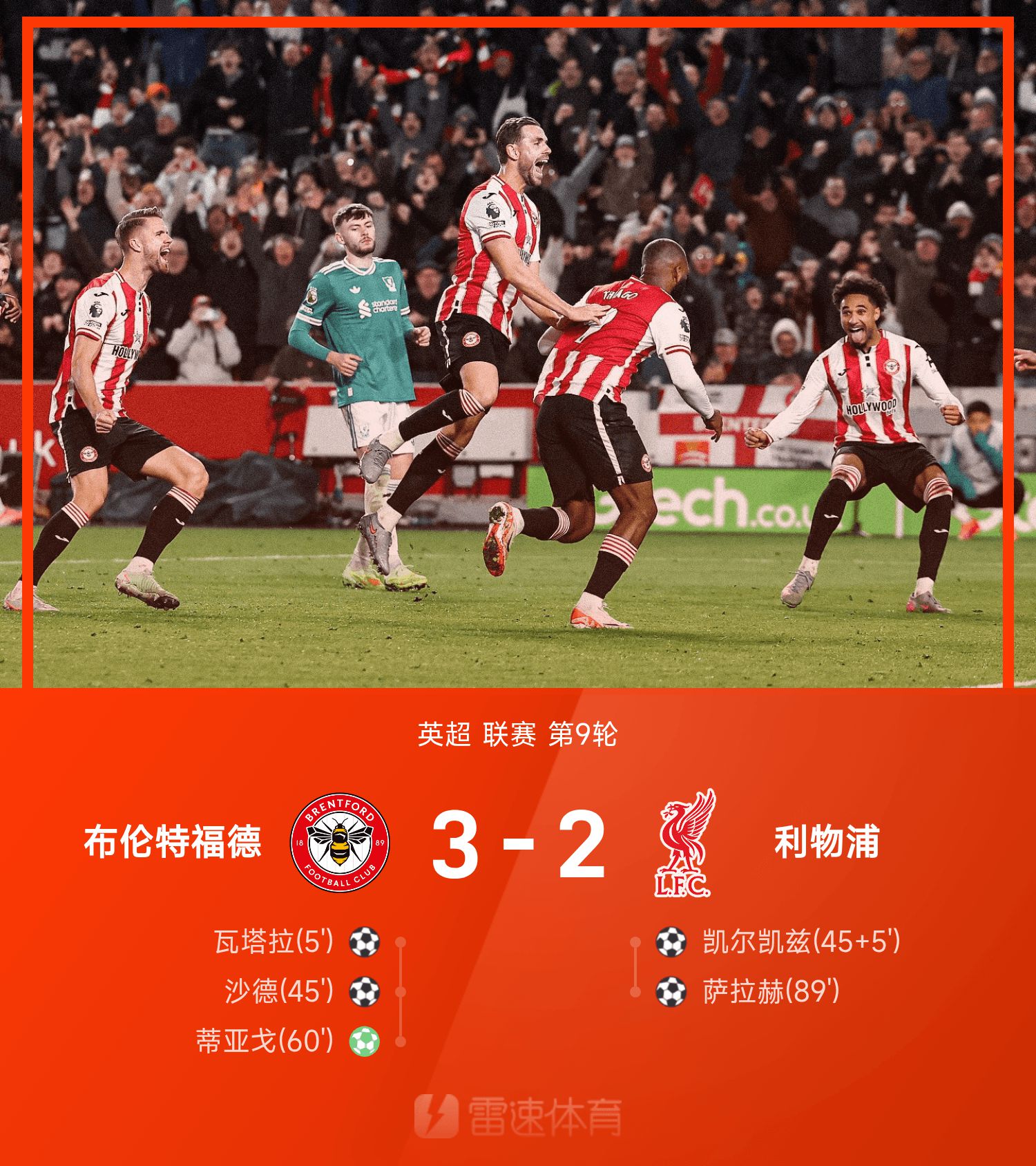 英超战报:蒂亚戈点射,利物浦2-3布伦特福德,联赛事4连败