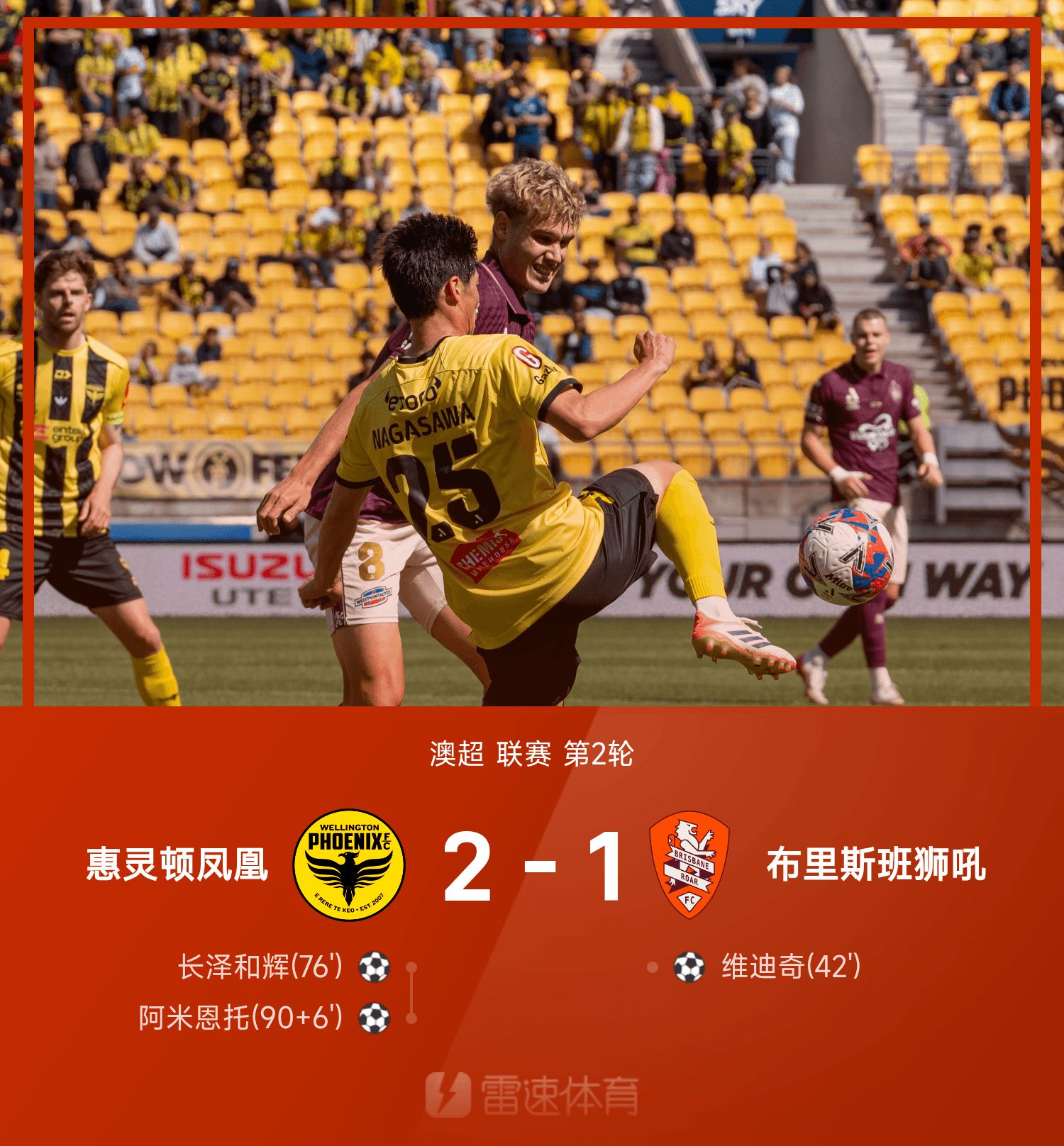 6686体育app10月26日讯 25/26赛季澳超联赛事第2轮,惠灵顿凤凰2-1战胜布里斯班狮吼。上半场竞赛,维迪奇抓住詹姆斯差错机会取得进球。下半场长泽和辉抢点破门扳平赛果分,阿米恩托补时最后一投弑旧主。