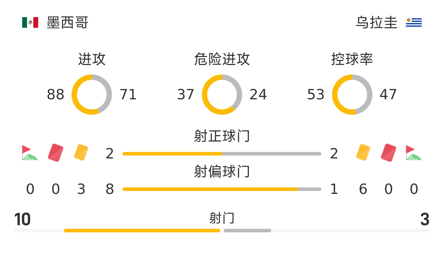 乌拉圭首发阵容:23-梅勒、13-巴雷拉、2-希门尼斯、16-奥利维拉、22-皮克雷斯、6-本坦库尔、25-萨纳布里亚(46’21-托雷斯)、10-扎拉扎尔(46’8-南德斯)、15-马丁内斯、7-阿吉雷、18-罗德里格斯(74’20-阿劳霍)